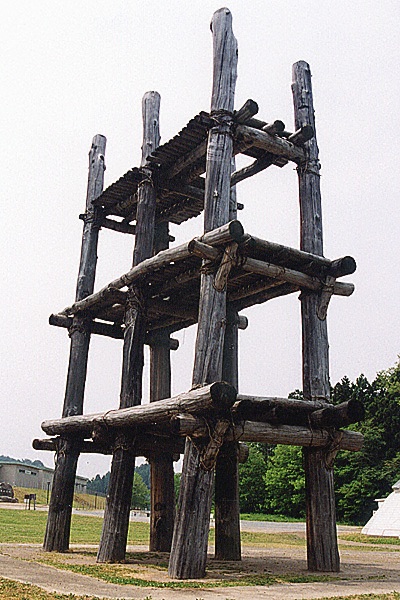 上は物見矢倉かな?下には水車もあります 青森県三内丸山遺跡の巨大建築物