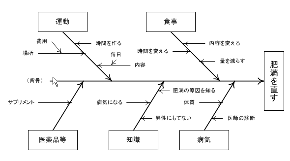 特性に影響を与える要因を大まかな分類で選び出して、背骨に向かって大骨を書きます。