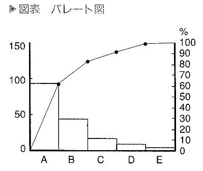 別名「 パレートの法則 」とも呼ばれています。 生み出しているという説ですが、一部の具体的な例を下記に挙げます。 ・社会の富の8割は全体の2割の富裕層が独占している。 ・故障やクレームの8割は、全部品のうち2割に原因がある。 つまり、80:20の法則は、世の中の何事にもばらつきが存在するということを パレート図 意義 パレート図を活用する事により、品質不良などの要因に複数の項目がある場合に、 解説 品質不良などに多くの要因が存在しているでしょう。その全ての要因を一から対策して やるべきことは、重要な要因を見つけだすこと、それがどれ程影響しているのかを見つ パレート図は不良品の内容などを項目に分けて調査した結果を、大きさの順に並べ 作成手順 1.分類した項目ごとにデータを集めて、集計します。