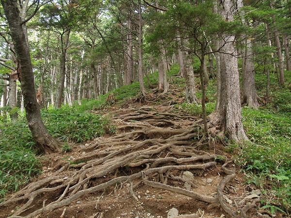 急登りが3時間30分ほど続きます。木の根が出ている所が多く、雨天時にはスリップ注意です。