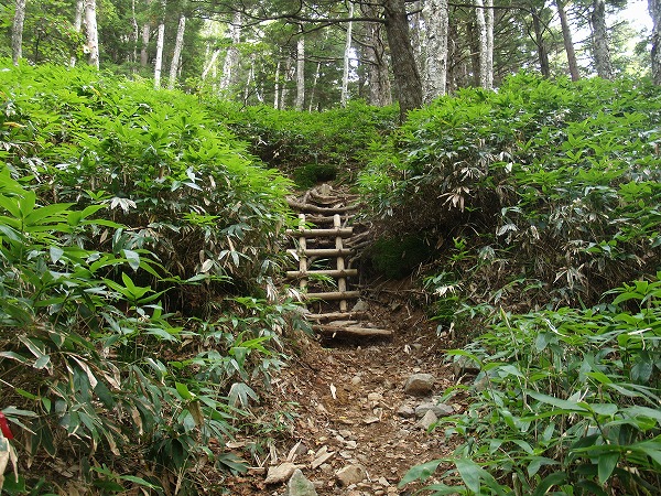 ダケカンバの林床には笹が茂り、二か所に丸太梯子が掛けられています。