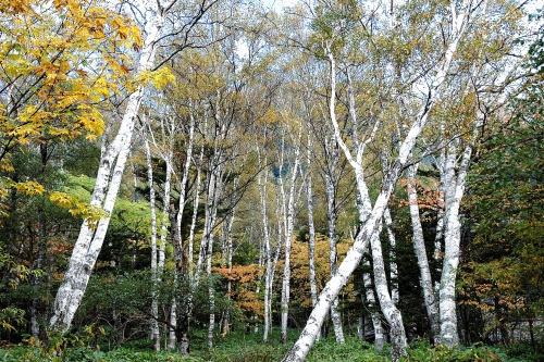 梓川の両岸の辺り一面に、木肌が白い白樺林が広がり、ただ見ているだけでも涼しげな風景です。