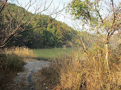 雑木林の右側に滝の池が見える