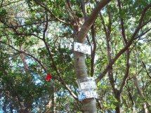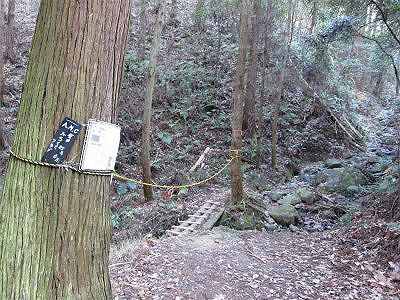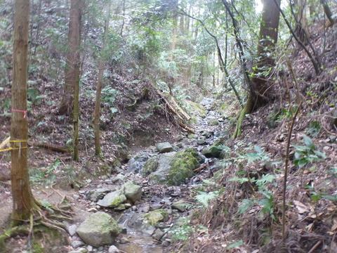 登山口から鬱蒼とした湿気のある沢沿いをしばらく進む、木に吊るされた「けー3」の