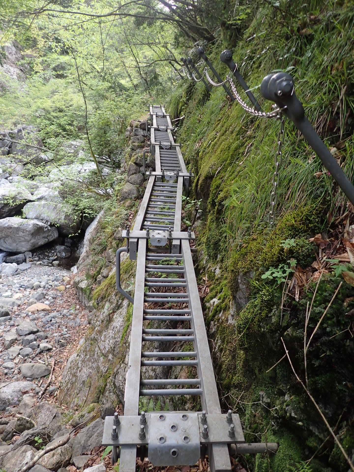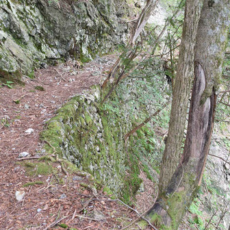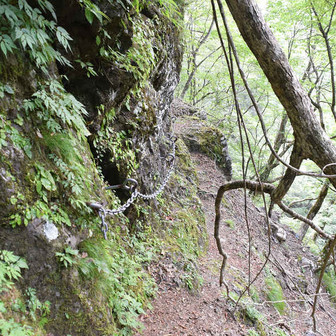 断崖を刳り抜いた縦走路に鎖が張られています。