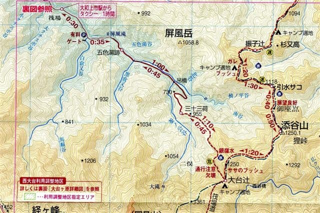 →三十三荷→釜の公吊橋→五色湯跡→屏風滝→35分(30分)→筏場