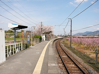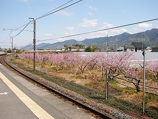 プラットフォーム周辺に広がる桃畑、この辺り一帯は、早生の桃である長田桃の産地です。
