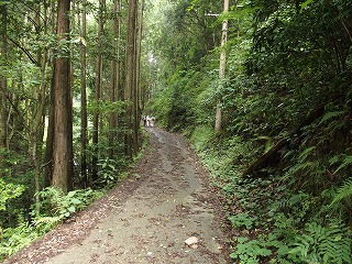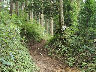 杉林に延びる平坦な山道を行くと右側に展望台らしき場所があったが、木立に閉ざされて眺望はきかない。