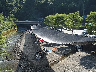 新関屋橋の下を流れる石川の河原にはテントが並び、家族連れやグループがキャンプを楽しんでいる。