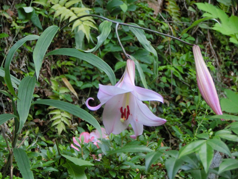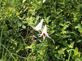 6月中旬から7月初旬であれば、コース沿いの斜面のところ所に白やピンク色の笹百合が咲いています。