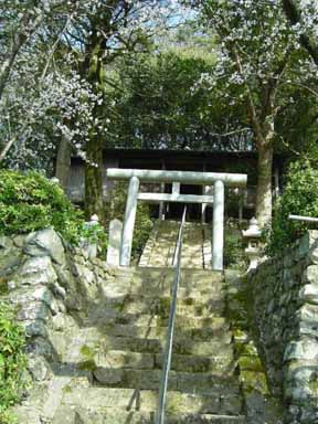 正面の道が狭く、石段が急。 緑につつまれた中にのどかに鎮座している。社日神の石碑があり、