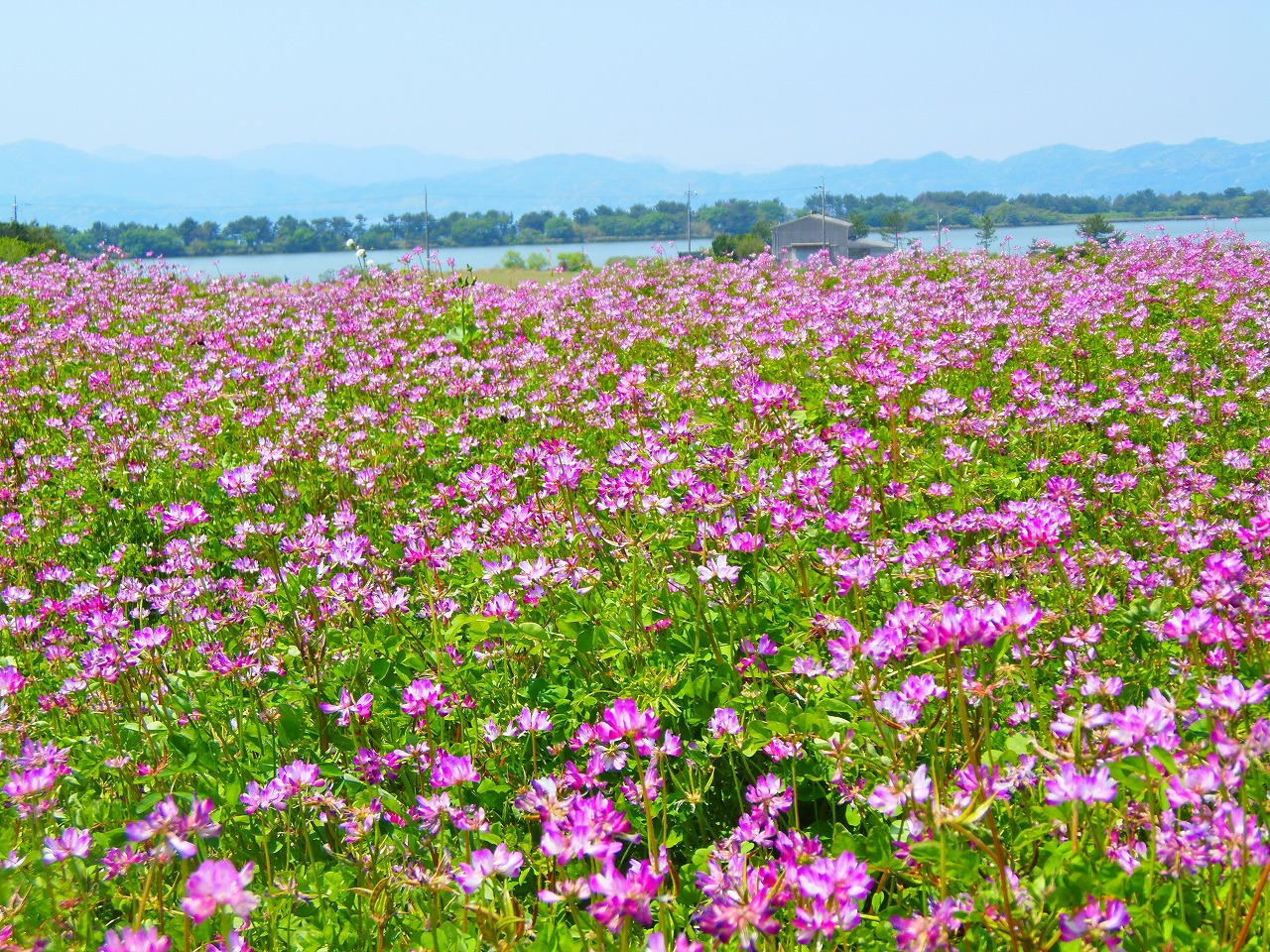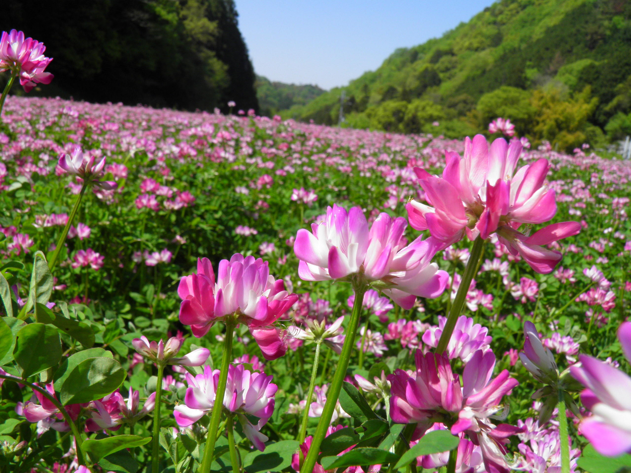 畑一面に群れ、彩り鮮やかに咲き誇る蓮華草は、里の春の風物詩、