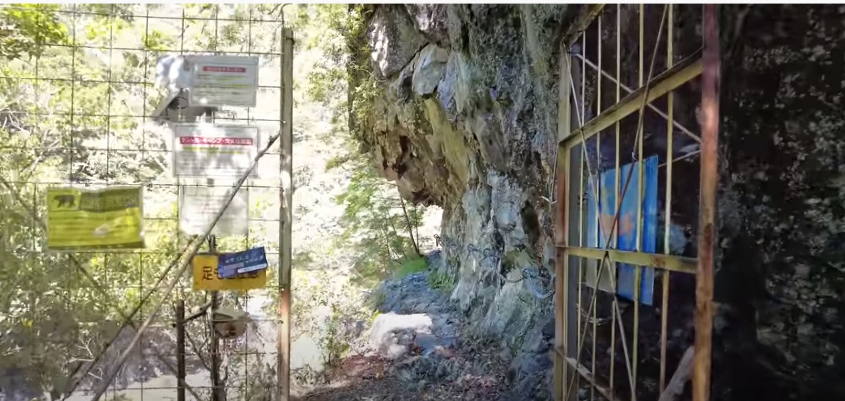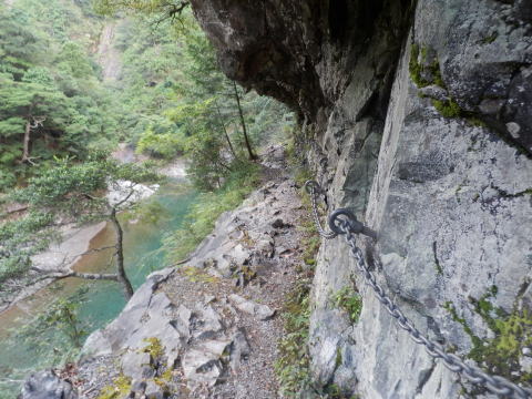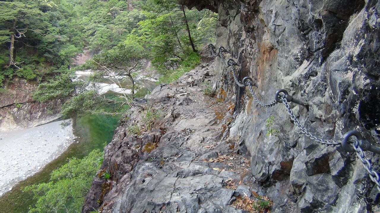 岩をくり貫いた断崖鎖場だ。碧く澄んだ川もにふっと吸い込まれそうになります。