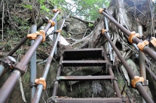 急勾配の斜面に梯子が付いていている登山道、ここが大杉谷の登山道最大の難所で上り