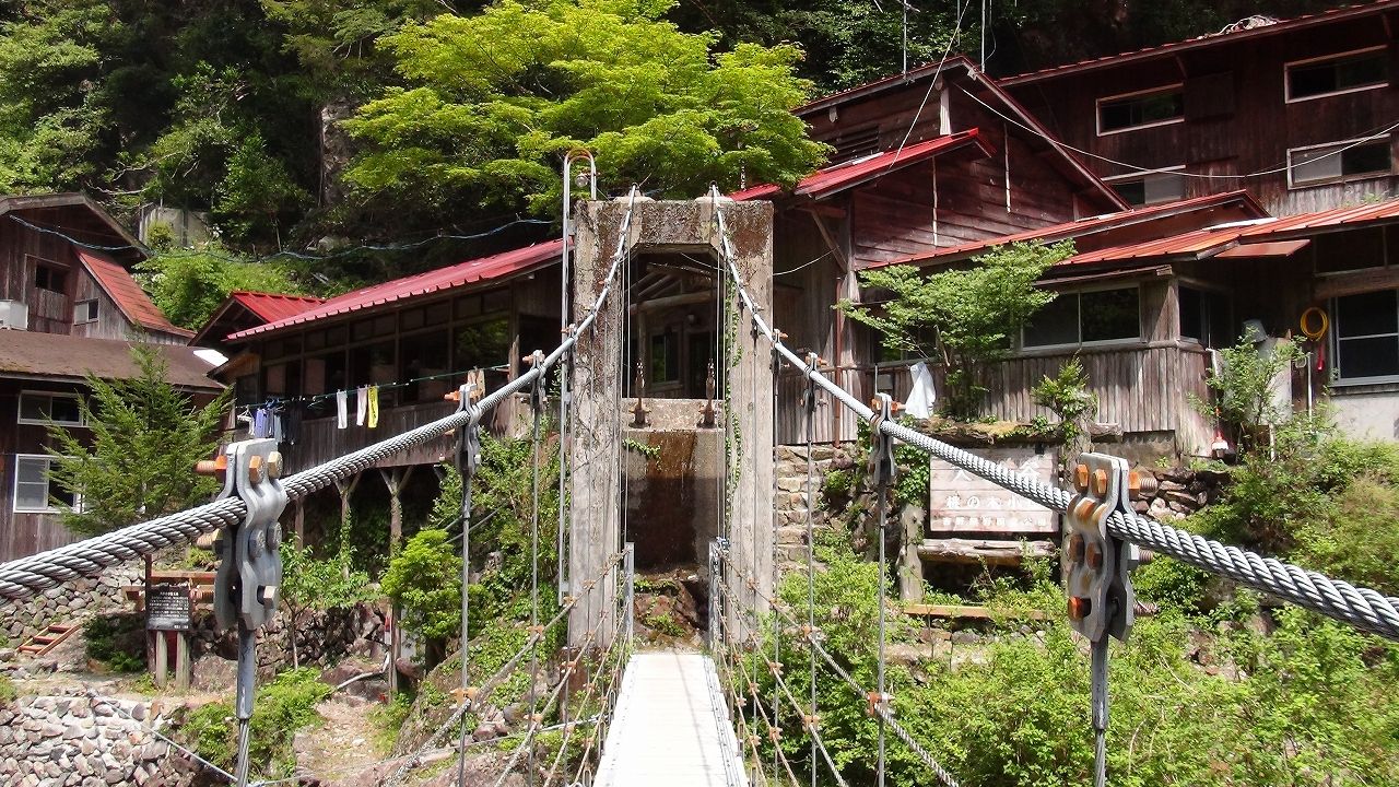 つり橋の向こうに見えるのが桃の木の家です。ここから七ツ釜滝まではあと690m。