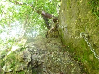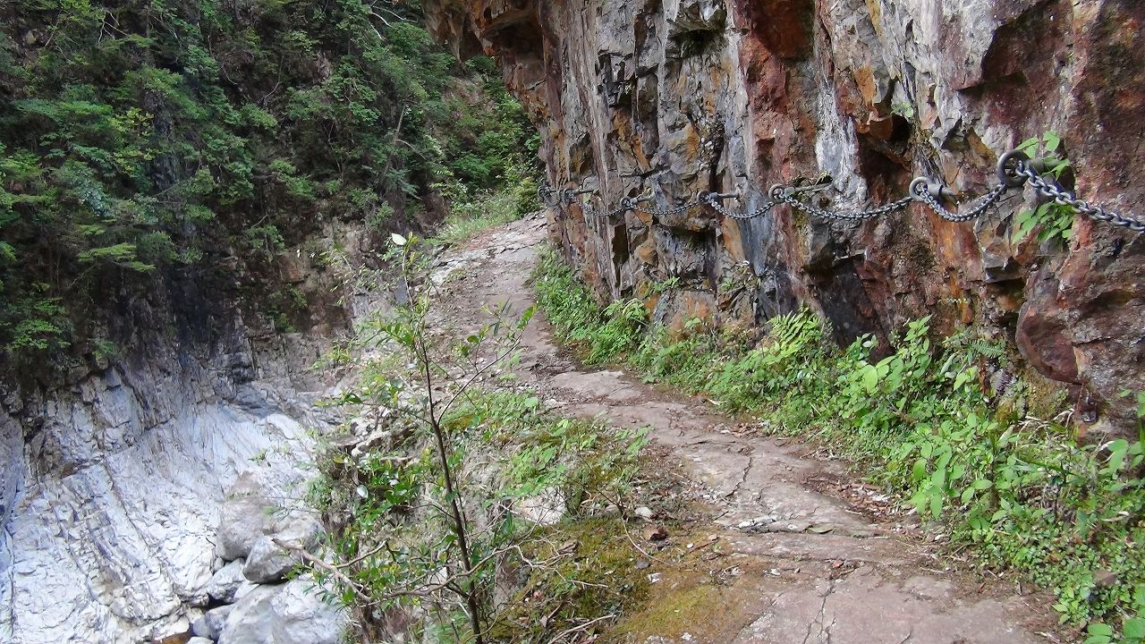 シシ淵の巻きは、大杉谷の登山道最大の難所、高度感があり、鎖も二重になっています。