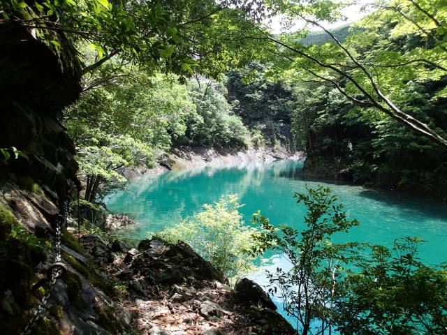 断崖鎖場の眼下に碧い川もが見え、水深が深くなるほどに碧いろも濃くなっている。