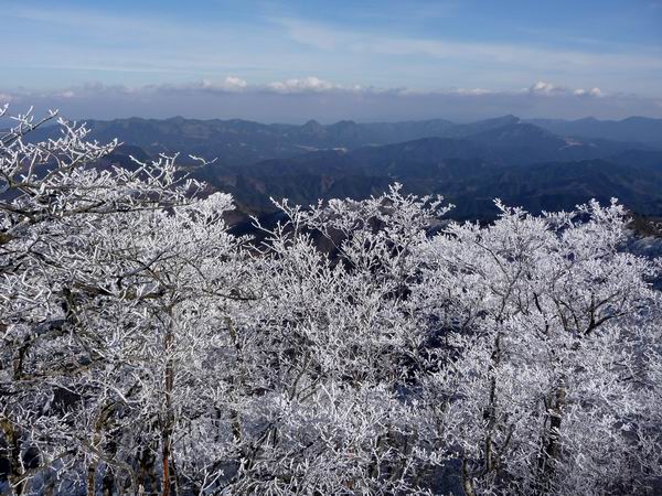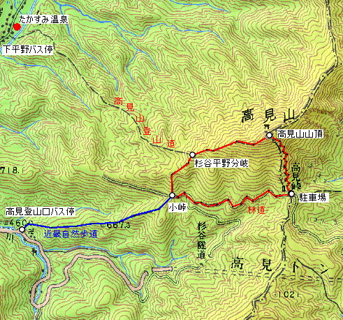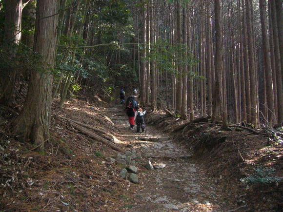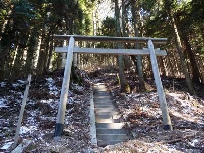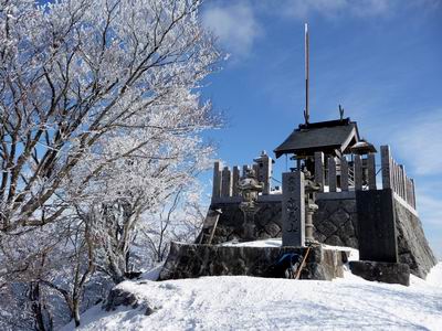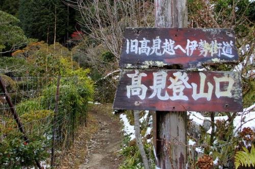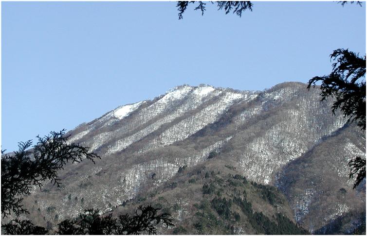 国道166号線を奈良県側から三重県側へ走らせていると、三角形の姿をした高見山が見える。 高見山は台高山脈の北端に位置し、関西では霧氷や樹氷を手軽に見られる山として有名。 近鉄榛原駅から臨時の霧氷号で高見山登山口(杉谷)へ直行する。 ![]() 小峠分岐付近より高見山 交通アクセスは、近鉄榛原駅より奈良交通バス、高見登山口停下車、榛原駅から45分程で到着する 登山コースは、高見山登山口(国道166号線沿い)→小峠→大峠→高見山頂 高見山山頂 → 高見平野(たかすみ温泉)縦断コース ![]() 高見山の樹氷 関西のマッターホルンといわれる高見山は、霧氷が見れる山として人気の山です。 ![]() 高見登山口(杉谷)バス停 登山口がちょっと分かりにくいが、バス停から100mほど戻った民家の脇にある。 ![]() 高見登山口は、バス停からへ歩いてすぐです ![]() 登り始めは旧伊勢南街道 バス停の近くにある登山口。傍の看板には旧伊勢南街道と記されている ![]() 登山口(標高460m)からしばらくは旧伊勢南街道を歩いて行きます。 かつては伊勢参宮の道であり,また紀州徳川家が江戸参勤交代にこの道を使用しました。 ![]() 旧伊勢街道 登り始めは、木段や石畳が続く整備された登山道でさほど苦にすることもなく、登ることができ、 積雪はあったものの滑る心配がなく、高見山登山口バス停から小峠まで約1時間です。 ![]() 小峠 小峠(標高820m)到着、ここまでは30分ぐらいです。 小峠鳥居を抜け急坂を進むコースと高見峠を目指すルートに分かれる分岐 ![]() 小峠の登山口 標高820m付近の小峠。 鳥居をくぐっていくのは平野分岐への直登ルート、小峠からは階段状になり、急勾配になり、 しばらくすると分岐点があり、高見平野方面への道と頂上の道に分かれる。 高見平野は温泉がある関係で下山道に使われることが多く、バスも帰りは高見平野から出るので 高見平野方面は、下山に使うことになる。 冬の高見山は、僅かな積雪があるだけ、アイスバーンがなく、アイゼンを履く必要がない。 キャラバンシーズで登山道の凍てついた霜を踏むと、サクサクと心地よい音がします。 登山道は、よく整備されており、危険なヶ所がなく、なんとなく登れる山ですが、 斜面の木々が樹氷に覆われ、辺り一面の銀世界となります。 ![]() 高角(たかすみ)神社と高見山頂上(1248.3m) 高見山山頂高角神社があり、奈良県と三重県に広がる山を一望できる ![]() 避難小屋の屋上が展望台 ![]() 山頂からの北側の眺め。曽爾高原の兜岳、鎧岳、倶留尊山などが見える ![]() 東側の眺め。左端に倶留尊山、右端に三峰山が見える 幕営は高見山の山頂付近と見当を付け、テント場の場所探しをする、北風を避けるため、 山頂の南側で少し低い所にテントを張り、夕食の準備に掛かる。 山頂付近に水場がなく、水汲みは、遥か麓の谷筋まで降りなければならない。 谷筋への水汲みは大変なので木々に付着した樹氷をかき集め、ホエブスで温めた鍋で樹氷を溶かし、 木屑等をタオルで越し、飯盒炊飯に使いました。 枯れ葉や木屑をタオルで越して取り除き、飯盒炊飯の水に使いましたが、タオルの編み目が 粗いため、炊き上がった御飯に細かい木屑が混ざり、ちょっと歯ごたえのよい御飯となりました。 ![]() ルートマップ |