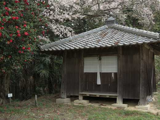 古木の足元には、ヤマザクラに見守られるように庚申堂が立つ。