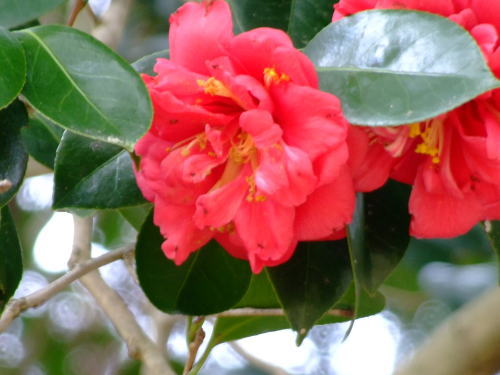 ヤマザクラの隣に八重の椿が咲いていますが、花芯が中央だけでなく、花弁の間からも出ている珍しい椿です。